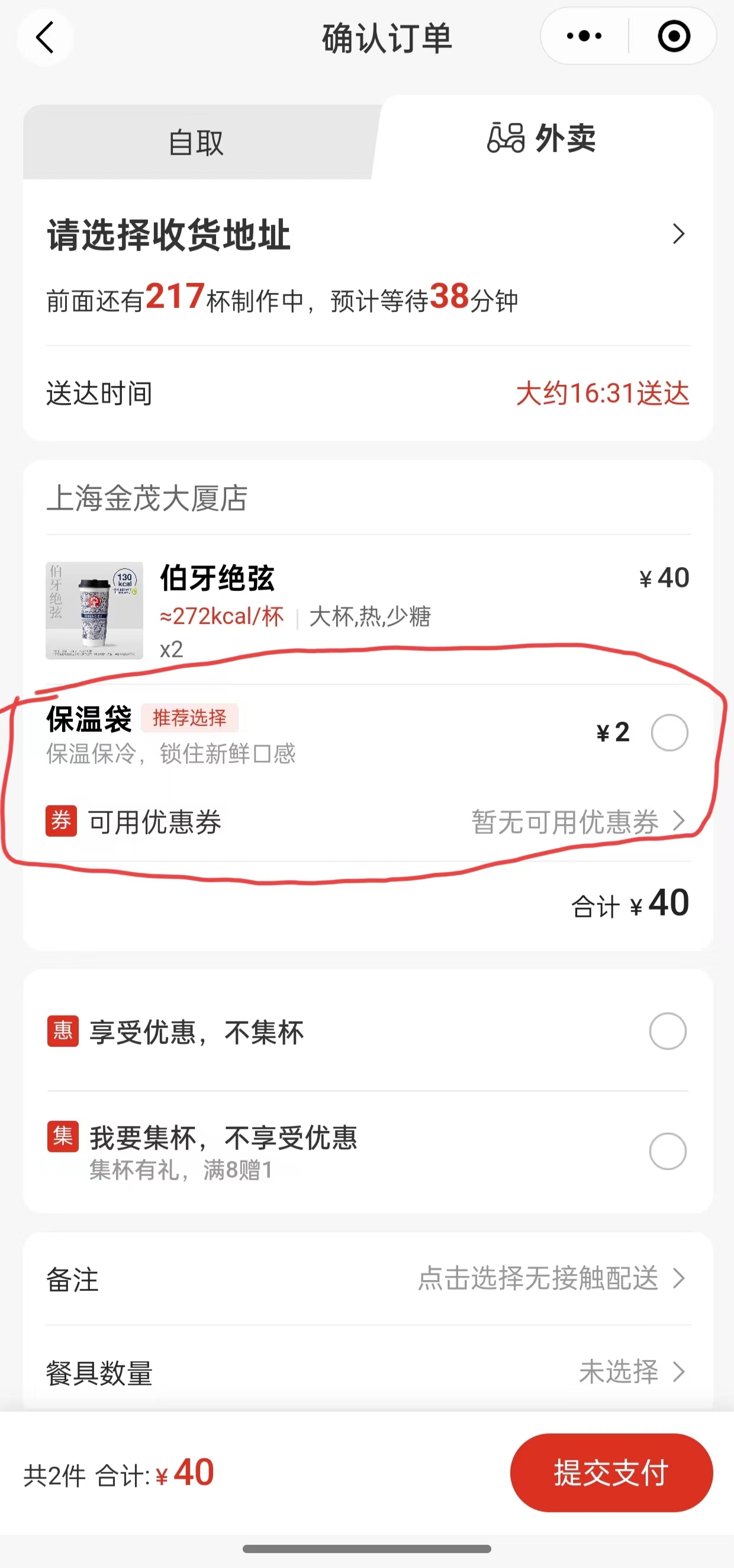 记者注意到,刚刚,在霸王茶姬小程序上,保温袋不再设置为默认选项,而是变为推荐选项,每件商品1元。