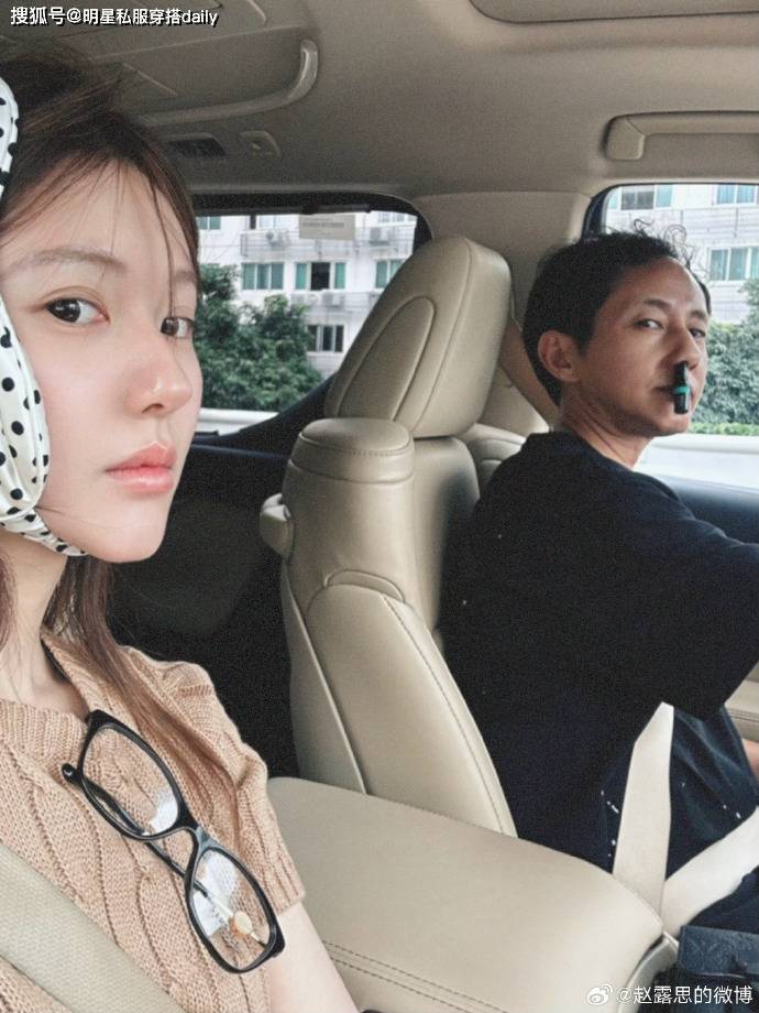 在车上的赵露思穿着一件奶咖色的针织短袖,眼镜随意的挂在了衣领处,她真的很喜欢这样挂眼镜!头上戴的是白色黑波点眼罩,不知道是不是在爸爸开车途中睡了一觉呢?