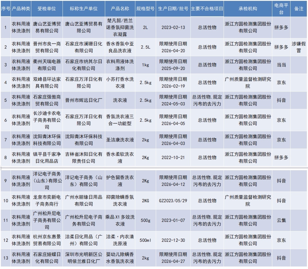 市场监管总局通报 136批次衣料用液体洗涤剂产品质量 国家监督抽查情况 其中 13批次衣料用液体洗涤剂不合格 此次共抽查136批次产品,涉及广东、河北、浙江等20个省份的125家生产单位,抽查发现13批次产品不合格。其中:有1批次产品涉嫌假冒,已交由属地市场监管部门处理;有13批次产品总活性物项目不合格,4批次产品规定污布的去污力项目不合格。 1. 标称唐山艺亚博贸易有限公司生产的楚凡懿/芭兰诺香氛抑菌洗衣凝露,主要不合格项:总活性物; 2. 标称石家庄市澜珊日化有限公司生产的香水香氛中亚良品洗衣液,主要不合格项:总活性物(备注:涉嫌假冒); 3. 标称石家庄市纳其尔日化有限公司生产的衣料用液体洗涤剂,主要不合格项:总活性物; 4. 标称石家庄万洋日化有限公司生产的小苏打香水洗衣液,主要不合格项:总活性物; 5. 标称晋州市辉远日化厂生产的洗衣液,主要不合格项:总活性物,规定污布的去污力; 6. 标称石家庄万洋日化有限公司生产的香氛洗衣液三合一功能型,主要不合格项:总活性物; 7. 标称沈阳青沐环保科技有限公司生产的圣洁康洗衣液,主要不合格项:总活性物; 8. 标称吉林省沐阳日化有限责任公司生产的香水柔软洗衣液,主要不合格项:总活性物; 9. 标称洋记电子商务(山东)有限公司生产的护色留香洗衣液,主要不合格项:总活性物,规定污布的去污力; 10. 标称广州水丽缘日用品有限公司生产的抑菌除螨香氛洗衣液,主要不合格项:总活性物; 11. 标称广州松升尼电子商务有限公司生产的乘品X1多效洗衣液,主要不合格项:总活性物,规定污布的去污力; 12. 标称洁柔日化用品(广州)有限公司生产的洁柔·内衣清洗原液,主要不合格项:总活性物; 13. 标称深圳市光明新区公明依兰雅日化厂生产的婴幼儿除螨香水香氛洗衣液,主要不合格项:总活性物,规定污布的去污力。 13批次不合格样品信息 资料:中国消费者报